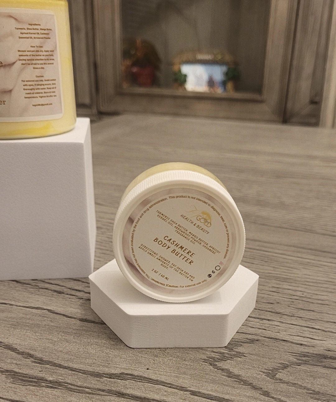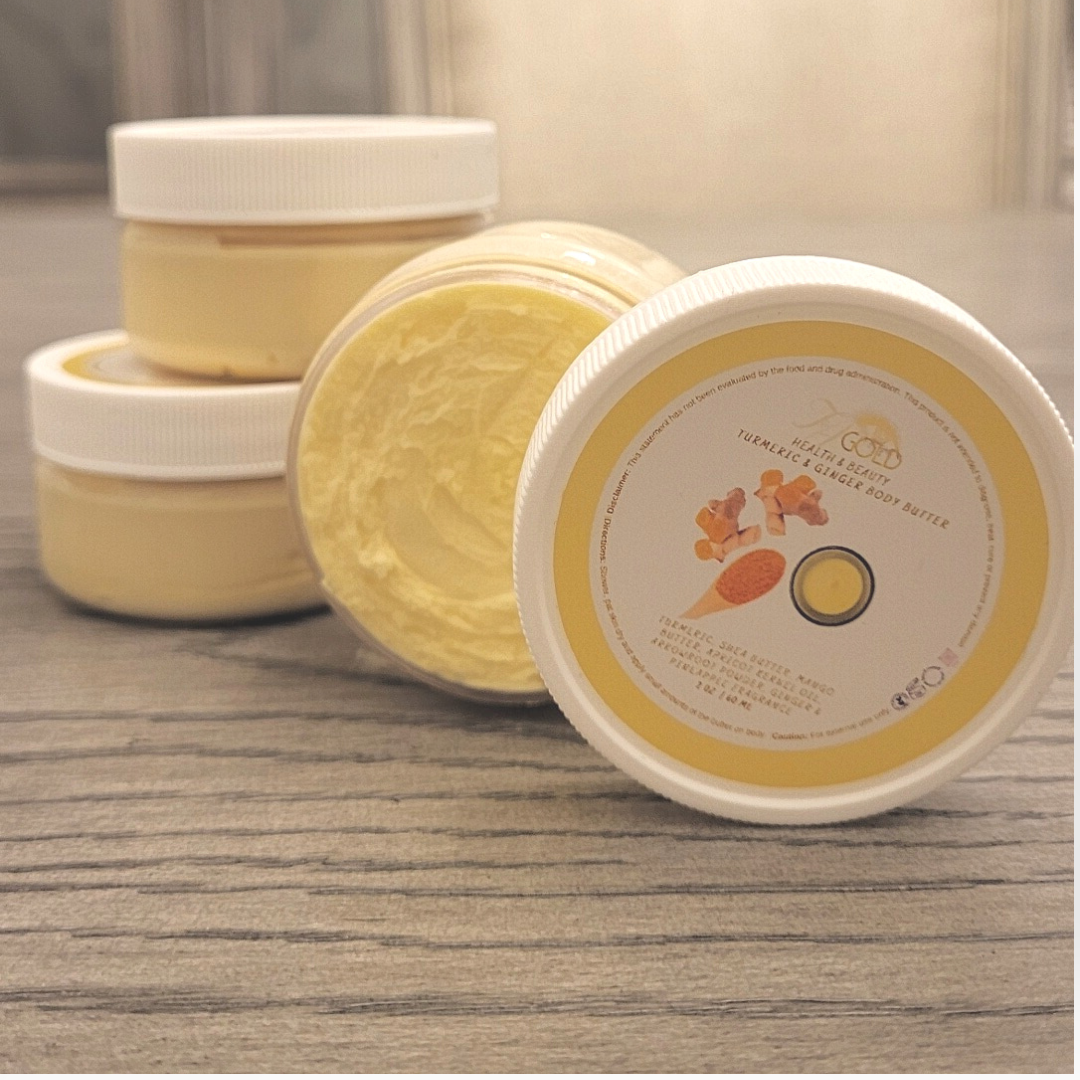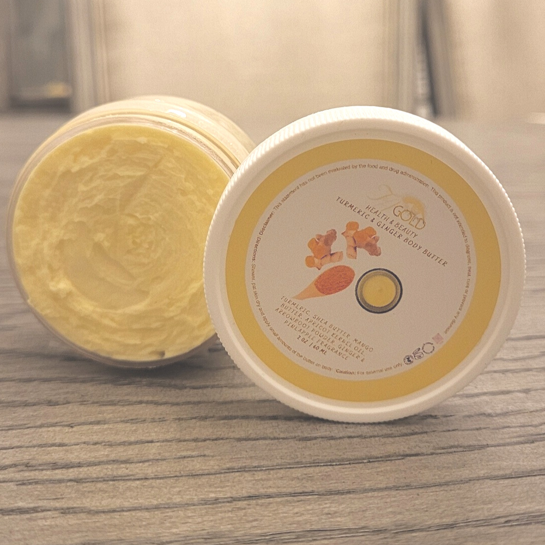 Ingredients: Turmeric Infused Shea Butter, Mango Butter, Apricot Kernel Oil, Arrowroot Powder, Fragrance and Essential OilsÂ